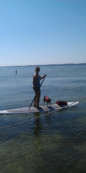 Once Boz got used to the life jacket during a few swimming sessions, we moved to the board in very shallow water. I probably looked pretty strange with a piece of string cheese tucked in my swimsuit strap, but I rewarded Boz with bits of cheese when he sat down in the middle of the board. Needless to say, having a dog move up and down the board between your legs makes balancing even more challenging!